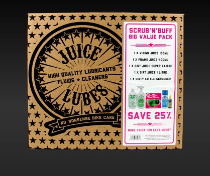 Scrub and Buff contains everything you need to keep your bike running beautifully for months. It’s a massive value bundle box that contains 10L of bike wash, all conditions chain lube, frame polish and our much-loved chain cleaning tool.
